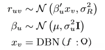 DBN可以看作是一个非常灵活的确定函数,它将fv映射到xv。它有数十万,甚至数百万个参数(表示为Ω)可以从训练数据中学习。我们假设ruv服从正态分布来解释用户评级中的噪声