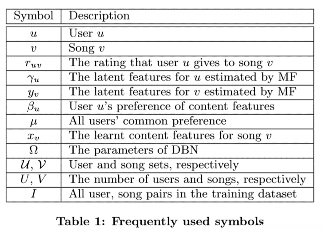 在歌曲相关因素中,音乐音频内容是非常重要的。在大多数情况下,我们喜欢/不喜欢一首歌,这是因为它的音频内容具有一些特征,例如人声、旋律、节奏、音色、体裁、乐器或歌词。没有听内容,我们对这首歌的质量几乎一无所知,更不用说我们是否喜欢它了。因为音乐内容在很大程度上决定了我们的偏好,所以内容应该能够为推荐提供良好的预测能力。