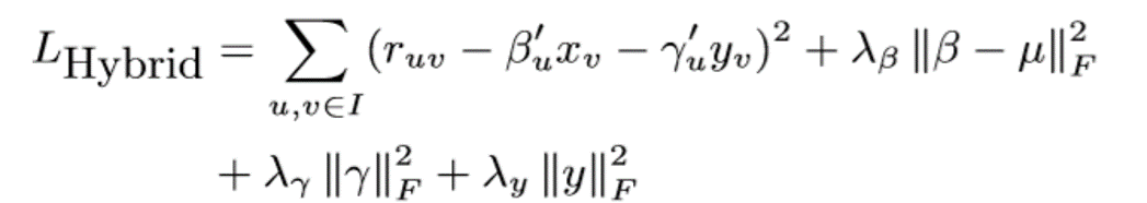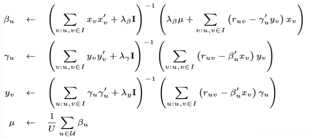 Lhybrid的不是凸函数,但如果我们固定βu、μ、γu和yv中的任意三个,则它是凸的,并且可以得到封闭形式的最优解。因此,我们使用交替最小二乘(ALS)算法优化LHybrid:首先将LHybrid对四个参数的导数设为零,然后求解方程,得到以下四个更新公式。然后我们迭代它们,直到LHybrid收敛,或者直到验证集上的预测性能达到最高点。