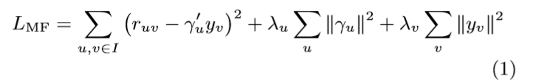 模型的负对数似然可以简化为方程(1),其中I是训练集中的用户歌曲对。λu和λv通常使用验证数据集进行调谐: