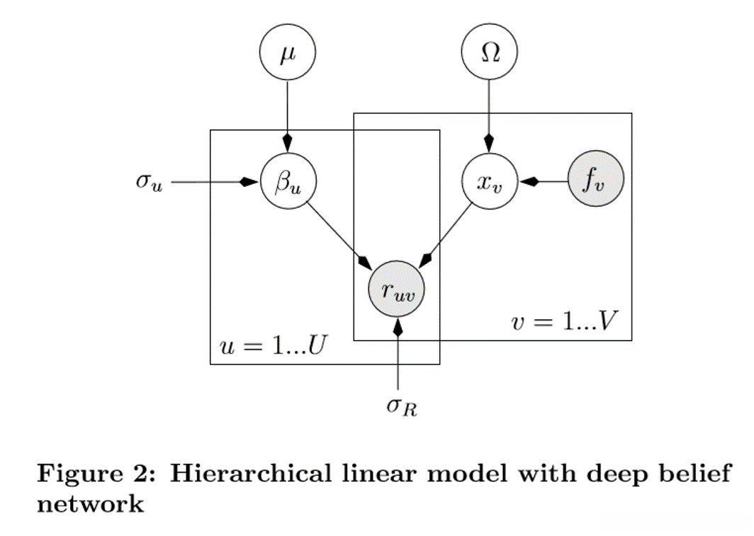 我们假设song v的音频内容为fv,其自动学习的特征向量为xv。用户u的音乐偏好表示为向量βu。u对歌曲v的评分表示为ruv,是xv和βu的内积。我们使用μ表示所有用户的共同音乐偏好,即所有用户βu-s的平均值。模型(figure 2)表示为: