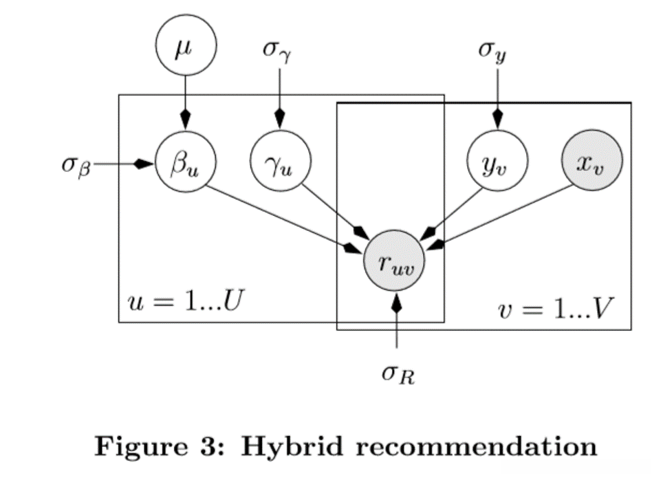 在我们的混合模型(图3)中,我们假设已经知道每首歌的音频特性xv。γu、yv和βu不是直接从PMF和HLDBN的结果中获得,而是需要从数据中共同学习。通过CF部分γu‘yv和内容部分βu’xv之和预测额定ruv。γu和yv的prior按照PMF模型设置,βu按照HLDBN模型设置。