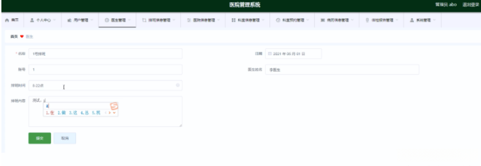 系统管理员具备新增医生排班信息的能力,并能完成修改、移除以及检索现有记录的操作。操作界面如上图所示