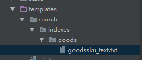 5)在templates目录添加search子目录,search子目录下添加indexes子目录,indexes子目录下添加app同名称的子目录goods,goods子目录下添加所需索引模型名小写goodssku_text.txt,以上名称均为固定格式,在goodssku_text.txt添加需要索引的字段