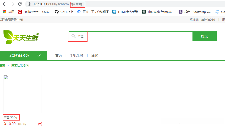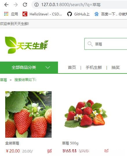 全文检索到现在算完成了大半,现在还有一个问题就是查找出来的数据并不完整,如图可见,盒装草莓并没有被搜索出来,原因是因为whoosh默认的引擎对中文分词的效果不是很好,导致它无法将一些词语进行分词搜索出来。