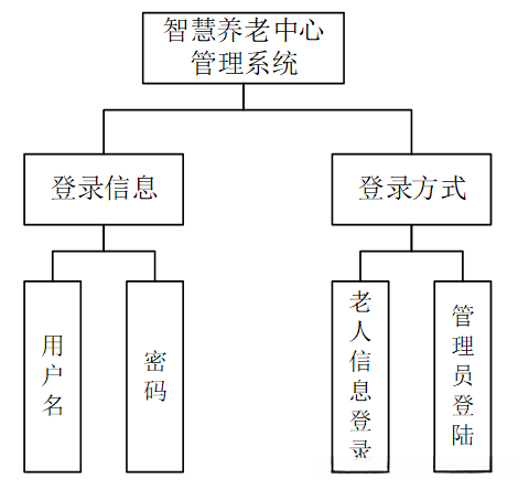 当系统启动时,在登录页面,请正确输入账号和密码,并选择切换至管理员页面或进入老人信息页面。其中的管理员页面负责处理所有相关事务及老人信息管理;而老人信息页面则支持正常运作的所有功能。此外,请注意查看附图中的系统登录结构图