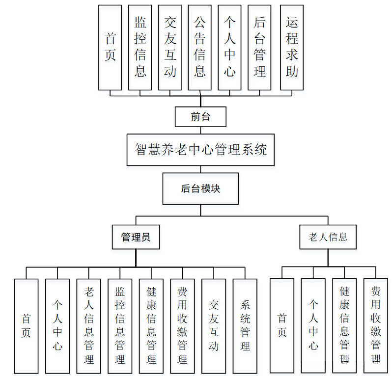 功能要求:管理人员可通过管理其个人中心来完成对老人信息、监控信息等的具体操作;具体而言包括但不限于老人信息、监控信息等,并涉及费用收缴及交友互动等功能模块 [3]。