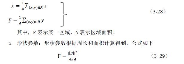 其中,B为区域周长,可以看出圆形参数为1,一定程度上这个参数可以描述区域紧凑性,对尺度变换和旋转变换不敏感。
