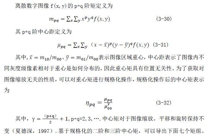 1962年,Hu[24]提出图像识别的不变矩理论,首次提出代数不变量的不变矩,通过对几何矩的非线性组合,导出了一组对图像平移、旋转、和尺度变化不变的矩。不变矩是一种统计特征,利用灰度分布各阶矩来描述图像灰度分布特性。