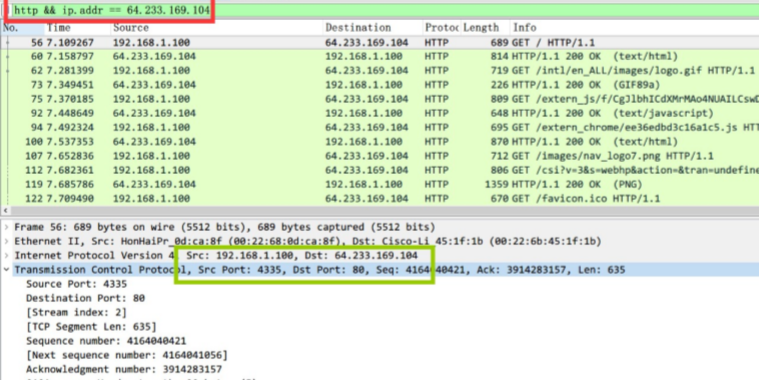 客户端实际上与多个Google服务器进行通信,以实现安全浏览。主要提供Google网站的服务器地址是64.233.169.104。为了仅显示客户端的请求和服务器的响应,在Wireshark过滤器中输入过滤式http && ip.addr == 64.233.169.104。从而,我们得以了解不同时间段客户端发送至Google服务器的IP数据包的源IP地址、目标IP地址、TCP源端和目标端口信息。
