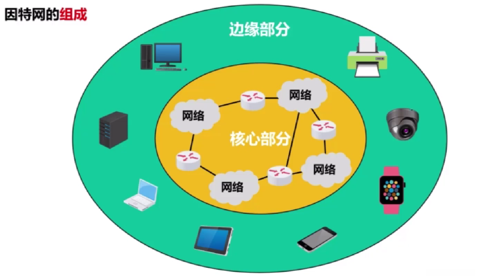 其中位于边缘的部分的计算机也被我们亲切地称之为"主机"。这些设备供用户直接使用的设备,并能满足用户的各种应用场景需求。在核心区域部署了大量异构型网络架构,并通过路由器进行互联。该区域的核心网络主要承担着保障网络连通性和数据传输的任务,在此之上构建起了分组交换的基础体系。在分组交换体系中扮演着关键角色的是路由器这一设备。
