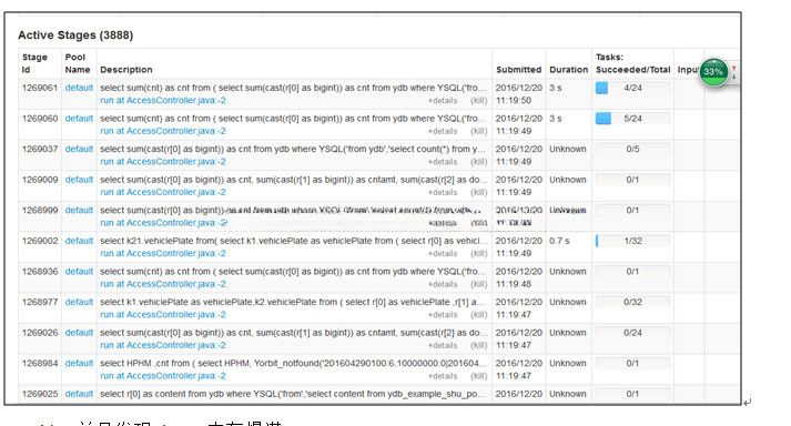 在对小规模SQL查询的压力测试过程中进行了观察,并发现了较多数量的activejob停留在spark UI界面中的等待执行的状态,并且这些activejob持续运行中。如图所示