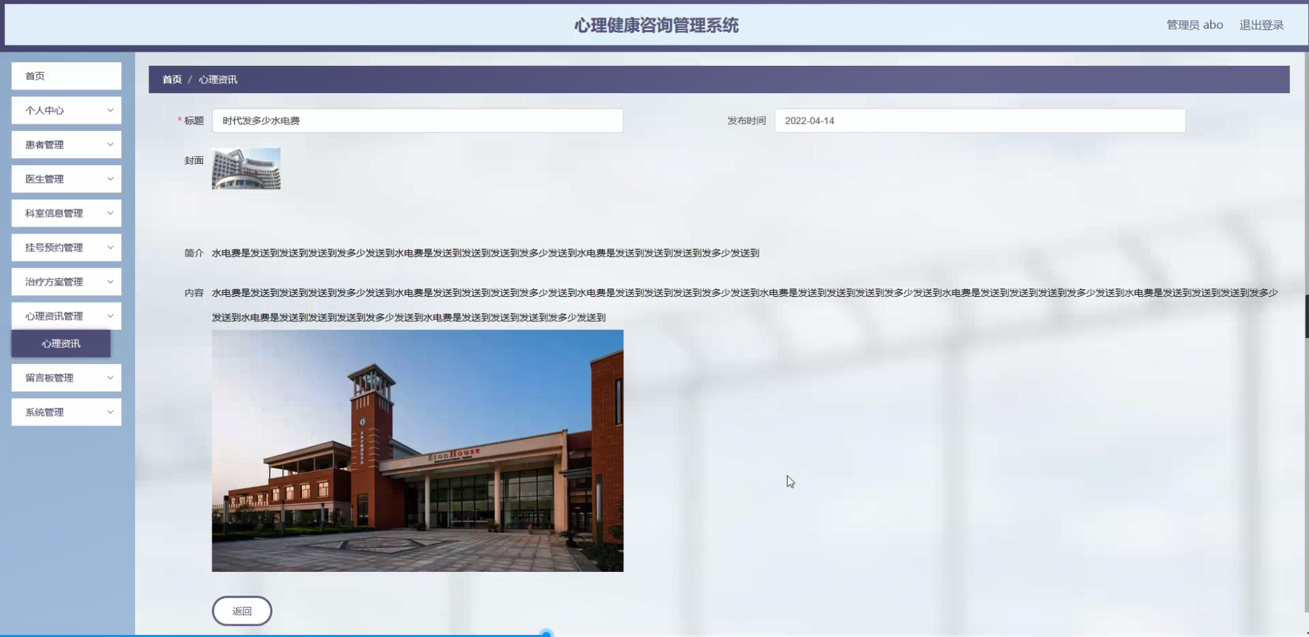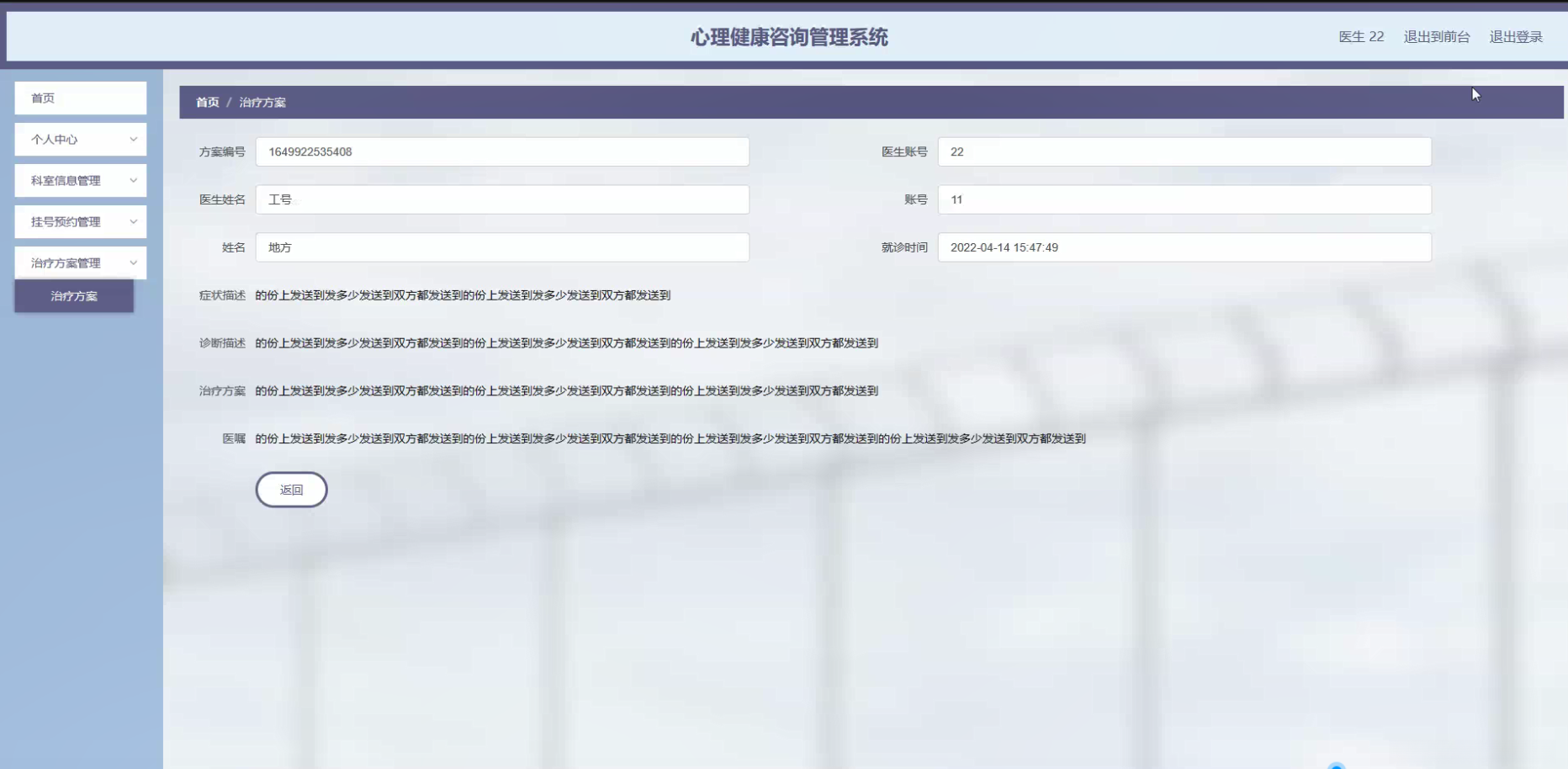 本研究旨在通过设计并开发一套心理健康咨询管理系统,实现患者信息的高效管理、医生资源的优化配置以及科室之间的协同工作。系统应具备挂号预约、治疗方案制定、心理资讯发布等功能,以满足不同用户的需求。通过该系统,我们期望能够提升心理健康咨询服务的专业性和便捷性,为更多需要帮助的人提供及时、有效的心理支持。同时,通过系统数据的收集和分析,为心理健康领域的研究提供有力的数据支撑。