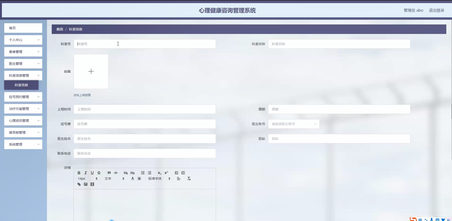 随着现代社会节奏的加快,心理健康问题日益受到人们的关注。传统的心理健康咨询管理方式多以纸质记录为主,不仅效率低下,而且难以有效整合和分析大量的患者数据。这在一定程度上限制了心理咨询服务的普及和发展。因此,开发一套集患者信息管理、医生资源共享、科室协作以及在线预约挂号等功能于一体的心理健康咨询管理系统显得尤为迫切。该系统旨在通过信息化手段,优化心理咨询服务的流程,提高咨询效率,进而为更多人提供及时、专业的心理援助。