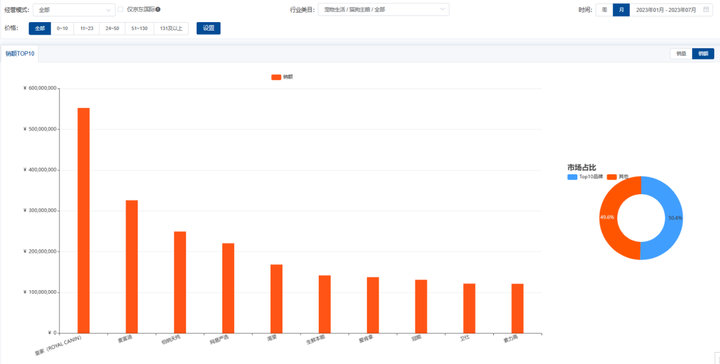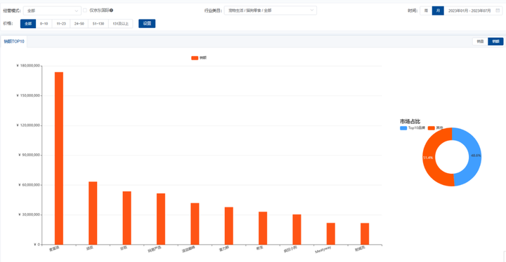 根据鲸参谋电商数据分析平台的相关数据显示,2023年1月-7月,京东平台宠物主粮(猫狗干粮、处方粮及湿粮)的销量将近3000万,同比增长约21%;销售额将近43亿,同比增长约11%。