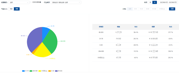 当前,宠物食品市场中中端产品的受欢迎程度较高。鲸参谋数据显示,在宠物主粮市场中,产品价格在“80元-263元”及“264元-509元”这两个区间的产品交易额占比较高,截至7月份,两区间的产品交易额分别为16亿+和13亿+,市占分别为38%和31%。
