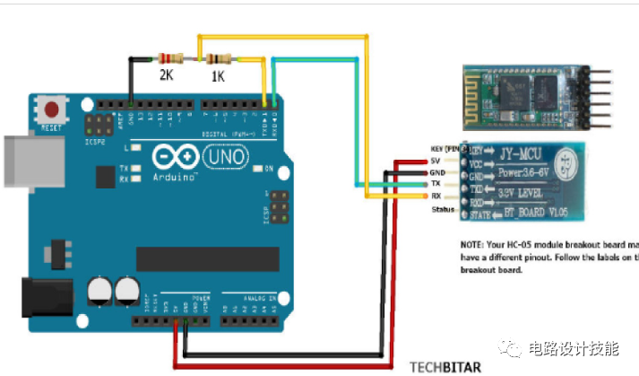两个电阻器用作分压器,将 5 伏降至 3.3 伏,以便蓝牙可以接收来自 Arduino Uno 的数据。