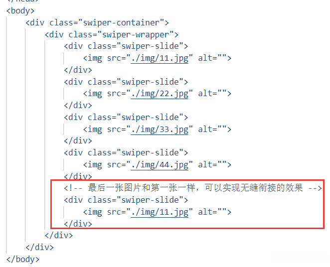 最终效果具备轮播能力,在当前的操作中当轮滑到达最后一个页面时会直接从该页面跳跃至第一个页面并结束操作。为了达到预期效果即让最后一批览结束后能够缓慢过渡至初始页面我们需要在最后一批图像后添加初始页面的图像即可