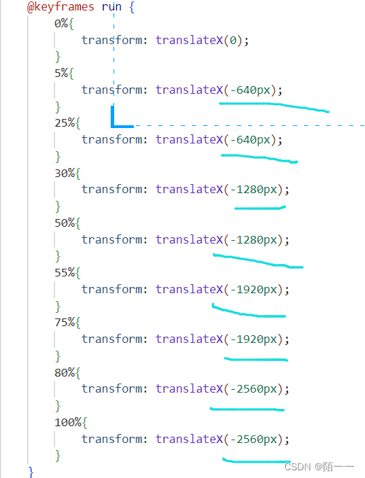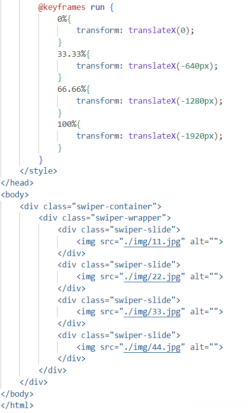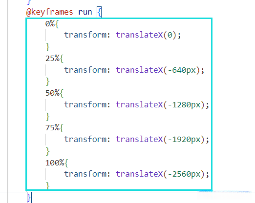 本代码的核心思路在于具体来说,在这段代码中适当增加关键帧数量以实现动态效果。具体而言,在0-5%区间内进行快速切换以展示初始状态;随后,在5%-25%区间内停留在此处一段时间内;接着,在25%-30%区间内切换至下一张图片;而在30%-50%区间内则维持当前图片以模拟典型的滑动效果;若希望某张图片在被点击时停止切换并固定显示,则需参考其中"1"部分的具体实现逻辑。