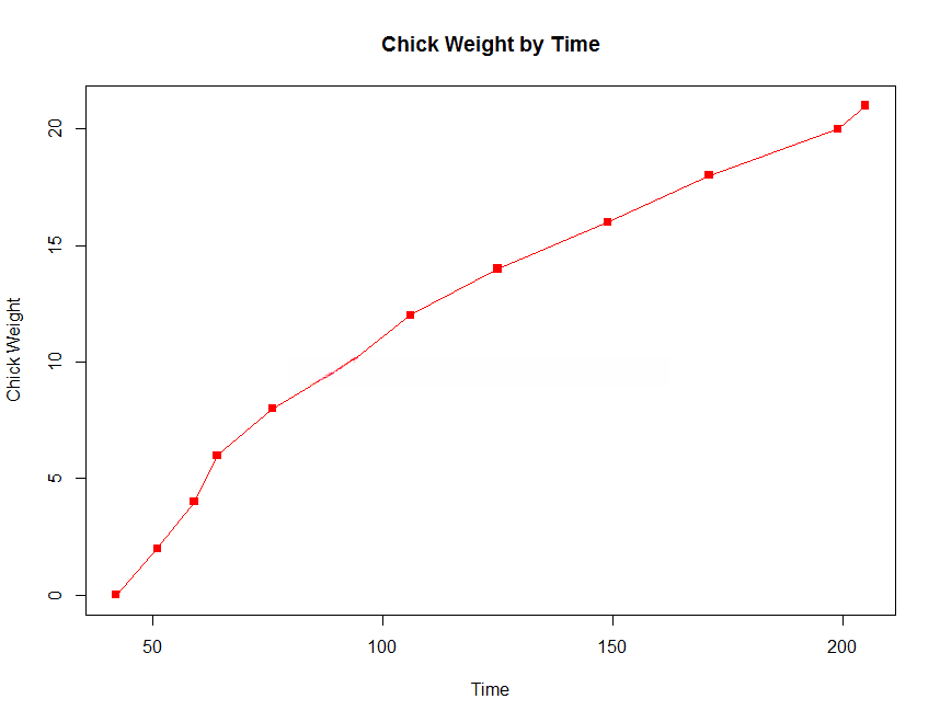 > plot(ChickWeightPart$weight,ChickWeightPart$Time,type="o",xlab="Time",ylab="Chick Weight",col="red",main="Chick Weight by Time",pch=c(15))