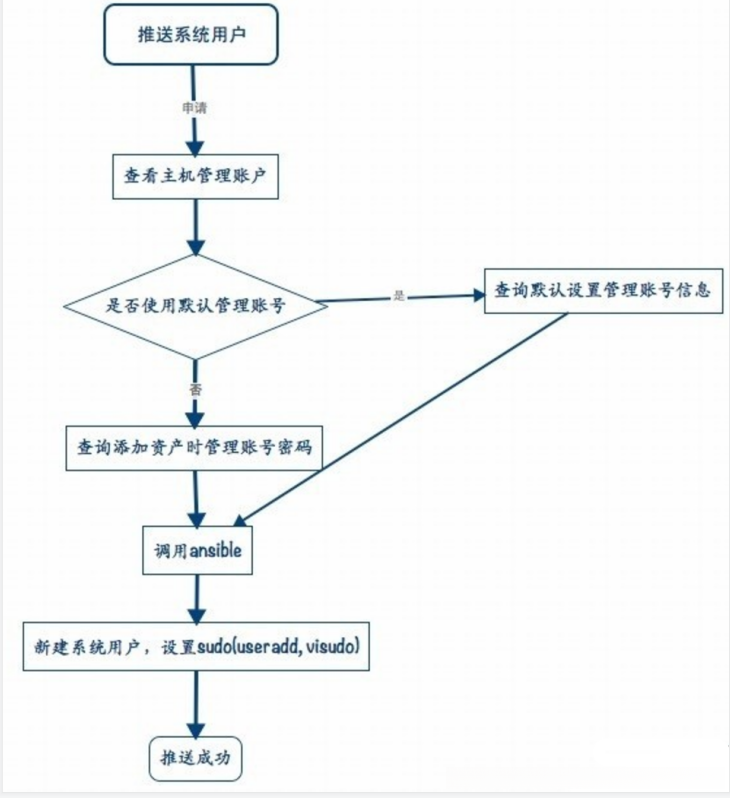 推送系统用户:添加完系统用户,需要推送,推送操作是使用ansible,把添加的系统用户和系统用户管理的sudo,推送到资产上,具体体现是在资产上useradd该系统用户,设置它的key,然后设置它的sudo,为了让用户可以登录它。