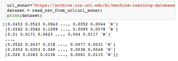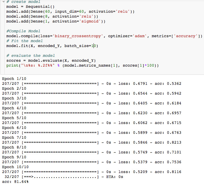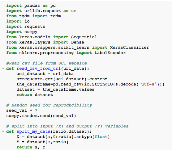本研究中, 我们将采用UCI数据库的Sonar数据集构建一个基本的预测模型实例. 在如下代码部分中, 我们将从UCI数据库系统直接获取相关数据, 并以60%至40%的比例分割为训练集与测试集. 基于Keras框架构建预测模型, 同时通过Scikit-learn对目标变量进行编码处理.