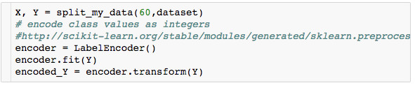 通过Scikit-learn中的LabelEncoder工具(标签编码器),我们对数据中的标签进行了数值化处理。具体而言,在这一过程中我们将字母R和M分别转化为对应的数字编码0和1,并且还采用了热编码方法(one-hot encoding),它将分类特征转化为更适合算法处理的形式。在本例中,请注意我们的目标变量Y同样是一个分类型变量,在应用该工具后将其转化为数值形式以供后续分析使用。