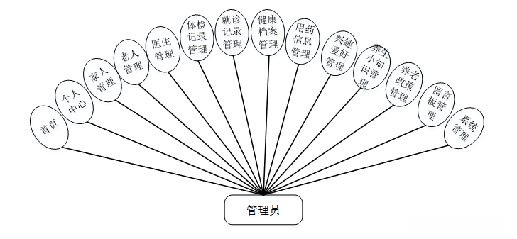 (5)管理员通过系统对可以实现网站系统管理,主要包括首页,个人中心,家人管理,老人管理,医生管理,体检记录管理,就诊记录管理,健康档案管理,用药信息管理,兴趣爱好管理,养生小知识管理,养老政策管理,留言板管理,系统管理等功能。管理员模块用例图如图3-5所示。