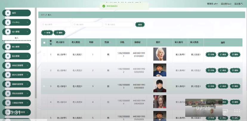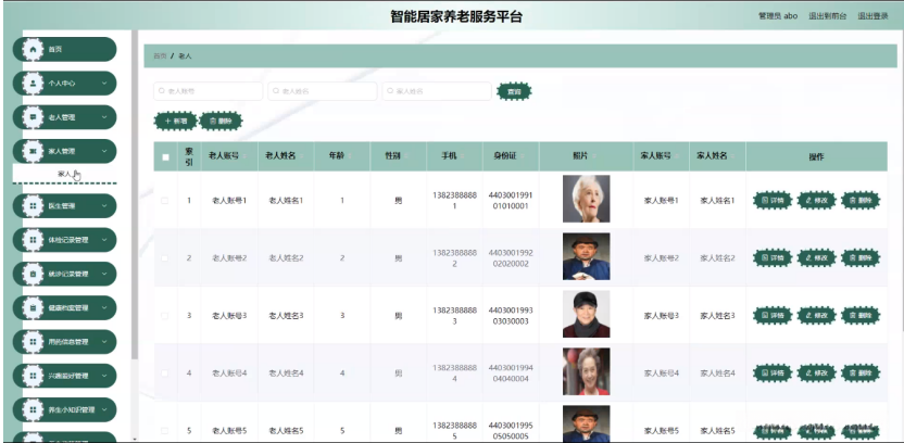 家人管理;在家人管理页面可以对老人账号,老人姓名,年龄,性别,手机,身份证,照片,家人账号,家人姓名等内容进行详情,修改或删除等操作,如图5-9所示。