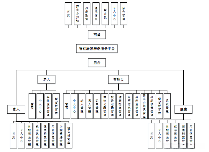 智能居家养老服务平台主要有四类用户。分别是管理员,家人,老人和医生,详细规划如图4-1所示。