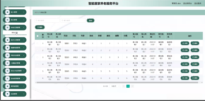 体检记录管理;在体检记录管理页面可以对老人账号,老人姓名,性别,手机,年龄,身高,体重,血压,血糖,心跳登,登记日期等内容进行详情或删除等操作,如图5-10所示。