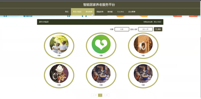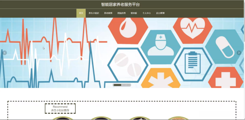 智能居家养老服务平台;在网站首页可以查看首页,养生小知识,养老政策,医院信息,留言板,个人中心,后台管理等内容进行详细操作,如图5-3所示。