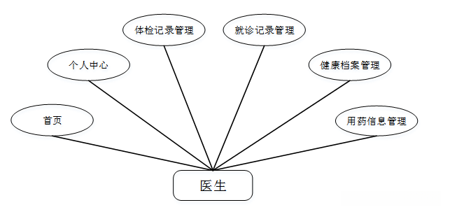 (4)医生模块主要包括首页,个人中心,体检记录管理,就诊记录管理,健康档案管理,用药信息管理等功能,医生模块用例图如图3-4所示。