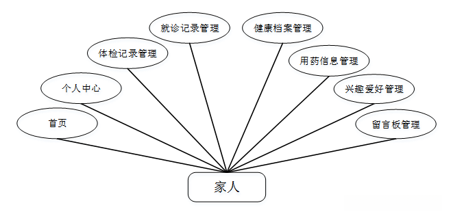 (3)家人模块主要包括首页,个人中心,体检记录管理,就诊记录管理,健康档案管理,用药信息管理,兴趣爱好管理,留言板管理等功能,家人模块用例图如图3-3所示。