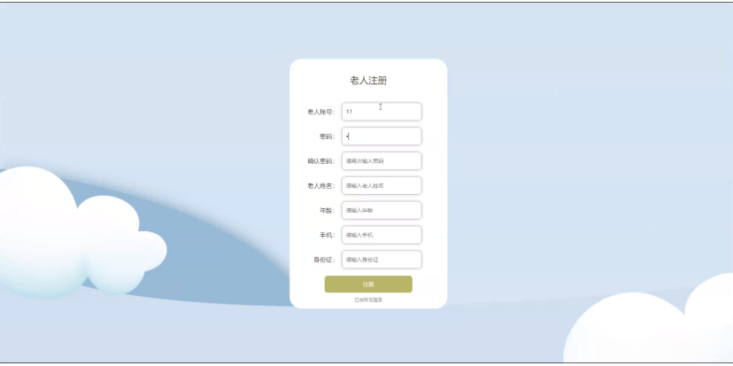 老人注册;在老人注册页面通过填写老人账号,密码,确认密码,老人姓名,年龄,手机,身份证等信息完成老人注册操作,如图5-4所示。