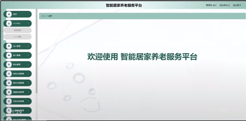 管理员登录系统后,可以对首页,个人中心,家人管理,老人管理,医生管理,体检记录管理,就诊记录管理,健康档案管理,用药信息管理,兴趣爱好管理,养生小知识管理,养老政策管理,留言板管理,系统管理等功能进行相应操作,如图5-7所示。
