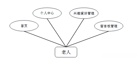 (2)老人模块主要包括首页,个人中心,兴趣爱好管理,留言板管理等功能,老人模块用例图如图3-2所示。