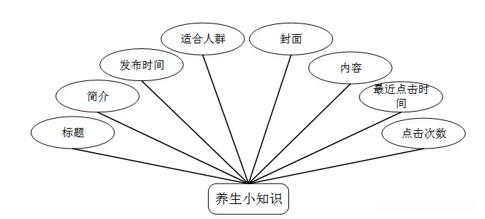 养生小知识实体包括标题,简介,发布时间,适合人群,封面,内容,最近点击时间,点击次数等属性。养生小知识实体图如图4-4所示: