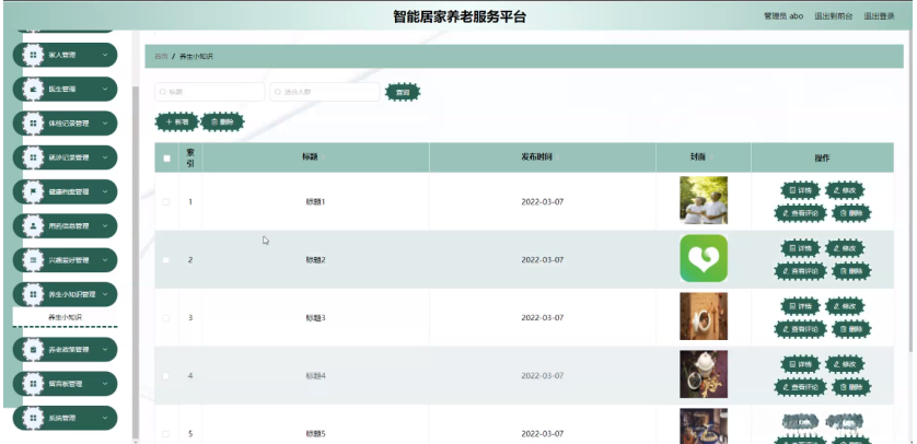 养生小知识管理;在养生小知识管理页面可以对标题,发布时间,封面等内容进行详情,修改,查看评论或删除等操作,如图5-12所示。