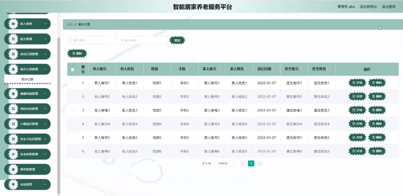 就诊记录管理;在就诊记录管理页面可以对老人账号,老人姓名,性别,手机,家人账号,家人姓名,登记日期,医生账号,医生姓名等内容进行详情或删除等操作,如图5-11所示。
