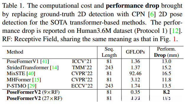 表1提供了有关现有基于变换器的方法处理长序列的效率以及对嘈杂2D关节检测的鲁棒性的更多定量结果。