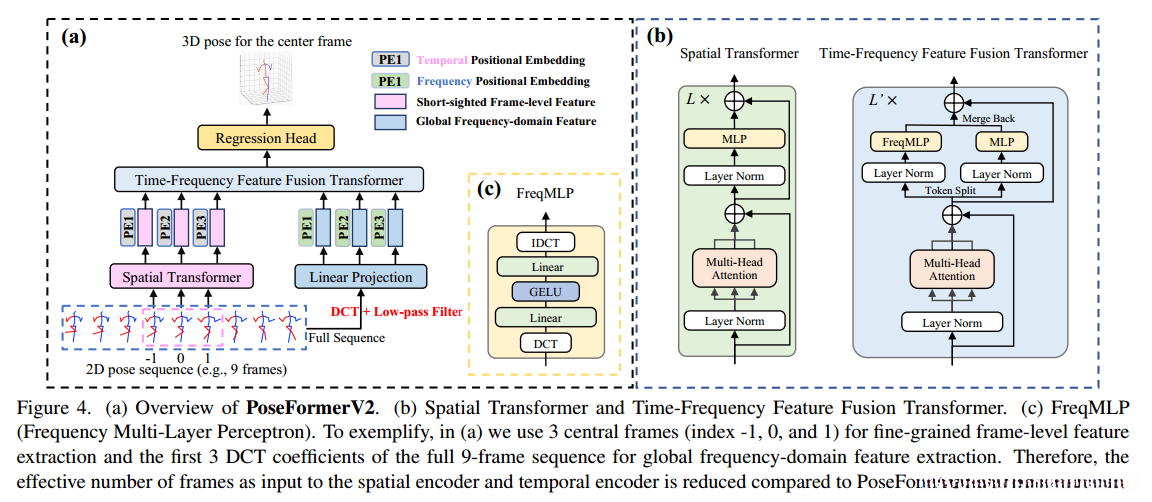 PoseFormerV2继承了PoseFormer的空间-时间架构,但对空间变换器编码器进行了修改,使其只观察长序列中的少数中心帧。然后,它将这些“短视”的帧级特征与完整序列的低频分量的全局特征相结合。