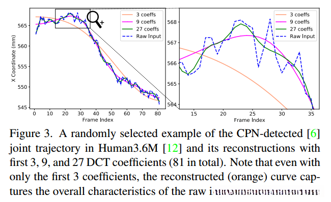 为了更好地说明选择这种表示的动机,作者提供了一个81帧的示例,展示了Human3.6M数据集中动作“Directions”的CPN检测到的关节轨迹,以及使用前3个、9个和27个DCT系数分别重建的轨迹(见图3)。