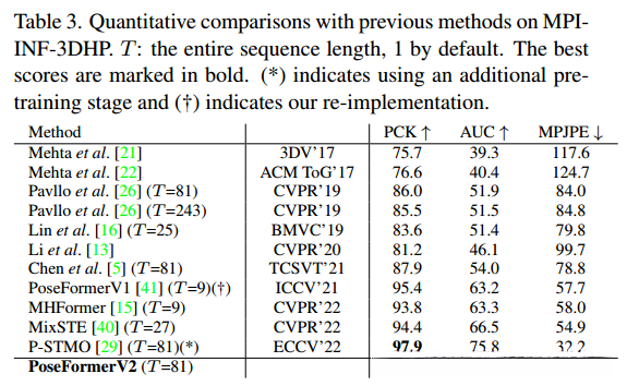 在MPI-INF-3DHP数据集上,PoseFormerV2使用了9个中心帧和9个DCT系数,并且超过了包括P-STMO在内的其他方法,即使P-STMO使用了掩蔽关节预训练。比较结果如表3所示