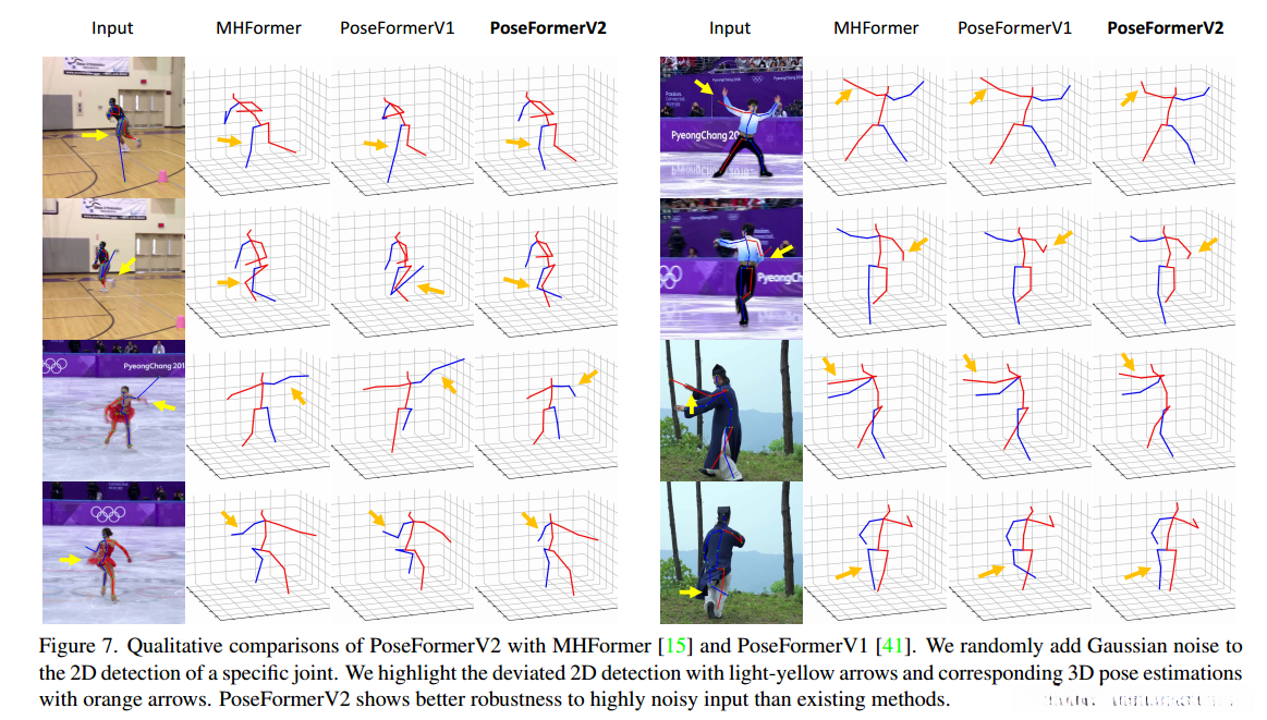 在图7中,作者将PoseFormerV2与MHFormer[15]和PoseFormerV1[41]进行了定性比较 。