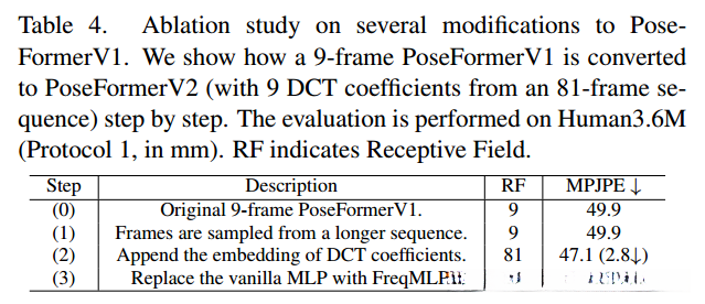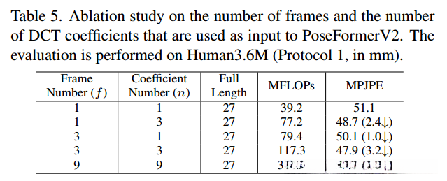 通过引入来自更长的序列(即81帧)的9个DCT系数,9帧PoseFormerV1的MPJPE降低了7.8% (49.9mm vs 46.0mm),表明引入DCT系数和FreqMLP可以有效地提高模型的性能。