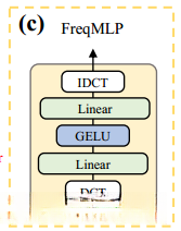 (3)逆变换: MLP的输出接着通过IDCT进行逆变换,将频域信息转换回时域,以便于和其他模型组件协同工作。