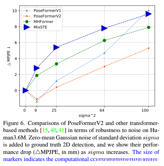 实验表明,随着高斯噪声标准差(sigma)的增加,PoseFormerV2的性能下降较小,同时效率更高。与PoseFormer相比更具有稳定性。此外方法也由于MHFormer(将二维探测器的不确定性纳入模型设计中)。除此之外还发现在噪声标准差为3时,其3D姿态估计的准确性甚至有所提高。