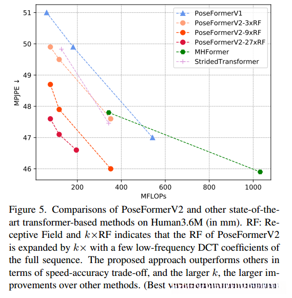 通过调整两个参数:输入到空间Transformer编码器的帧数 f 和整个输入序列的长度 F,来控制模型的感受野和计算复杂度。其中扩大比率(Expanding Ratio)是 F 与 f 的比值,即 E = F / f。这个比率反映了模型能够通过少量关键帧 f 来捕捉的整个序列 F 的信息量。当扩展比很大时,模型方法越有效。例如,当扩大比率为81时,PoseFormerV2在只有77.2 MFLOPs(百万次浮点运算)的计算成本下,达到了47.6mm的MPJPE(均方根关节位置误差),相比之下,MHFormer在342.9 MFLOPs的计算成本下,达到了47.8mm的MPJPE,计算效率低了4.4倍。除此在外在大约350 MFLOPs的计算预算和81帧的序列长度下,PoseFormerV2达到了46.0mm MPJPE的性能,而StridedTransformer达到了47.5mm MPJPE,表示PoseFormerV2的性能高出3.2%。图5的对比表明该方法在速度-精度权衡方面优于其他基于Transformer的方法(不包括MixSTE,因为他具有额外的预训练阶段,且计算量较大:仅3帧输入3420 MFLOPs)。