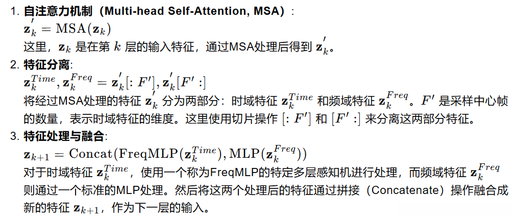 "Time-Frequency Feature Fusion"(时频特征融合)是一种将时域特征和频域特征结合起来的方法,以提高模型对跨帧时间依赖性的建模能力。为了缩小时域和频域之间的差异,网络对标准的变换器层进行了简单的修改: